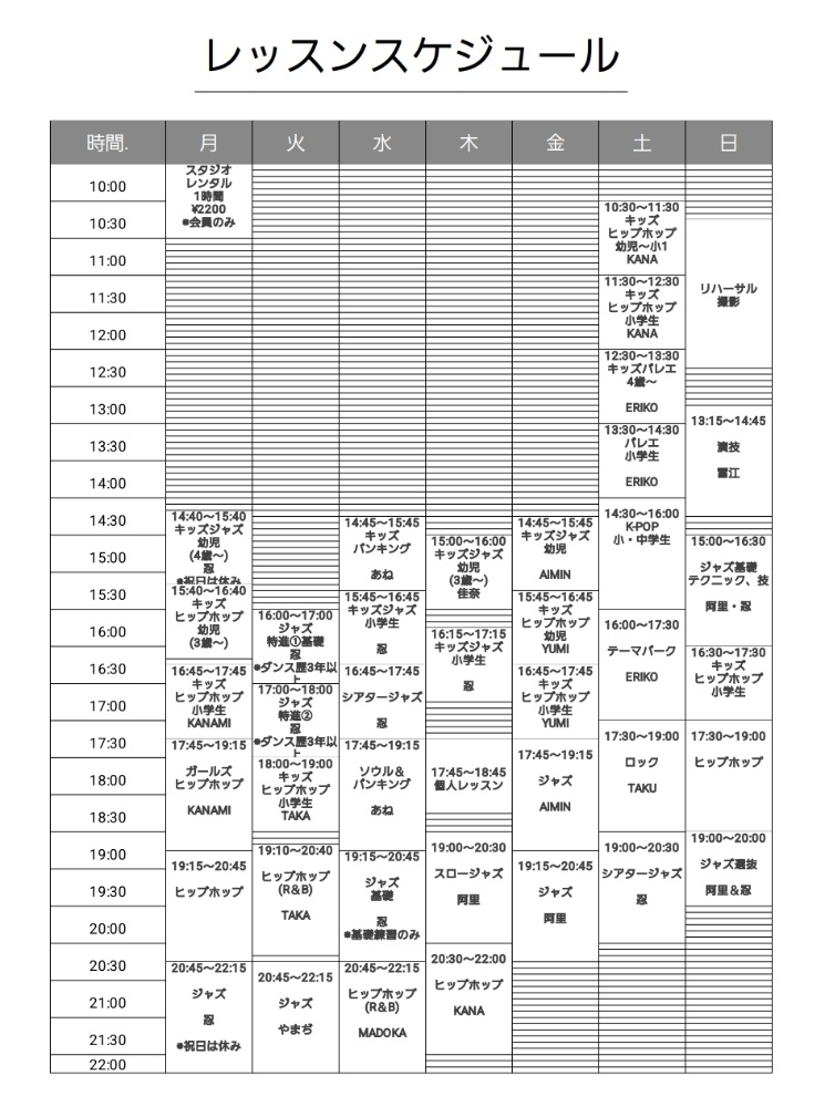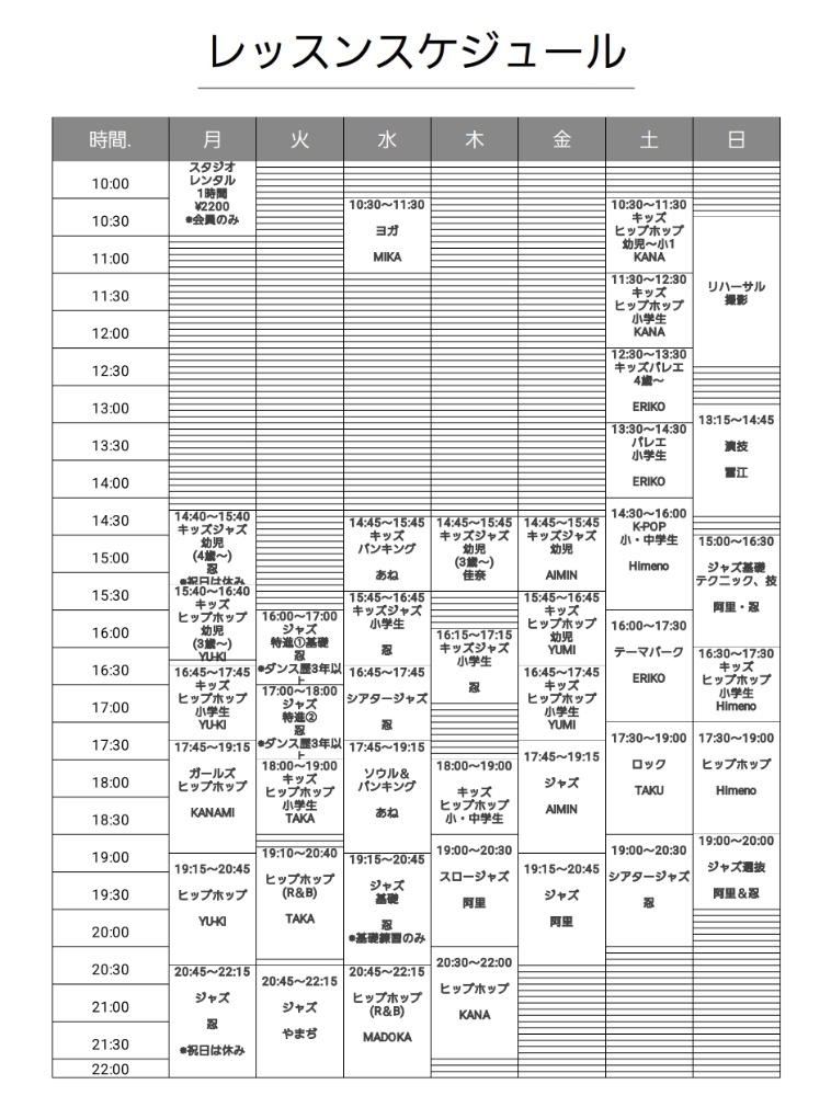 | 木曜日 | 【15:00〜16:00】 KIDS JAZZ (佳奈) 3歳〜 【16:15〜17:15】 キッズJAZZ (忍) 小学生 【19:00〜20:30】 スロージャズ(阿里) 【20:30〜22:00】 HIPHOP (KANA) |